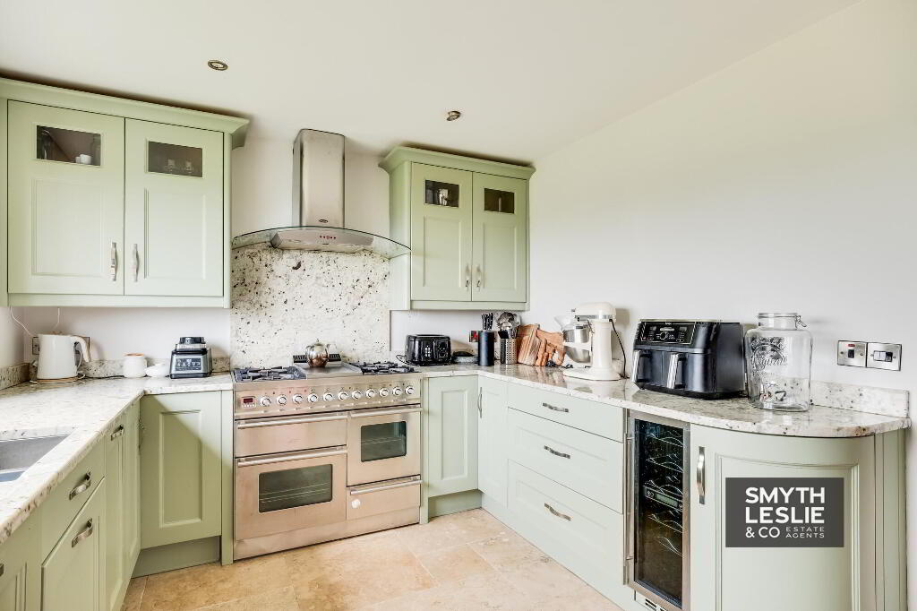 Luxury fitted kitchen with a range of high & low level units, granite work top, breakfast bar, integrated microwave & oven, wine cooler, dishwasher, Fisher & Paykel fridge freezer, Britannia range cooker with 5 ring gas hob, electric double oven & grill, extractor fan hood, granite splash back, s.s.sink & granite draining board, views towards Lough Erne from Kitchen window, limestone tiled floor Luxury floor, recessed lighting