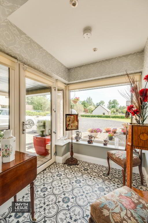 Glazed exterior door to covered entrance, decorative tiled floor, recessed lighting, dado rail.
