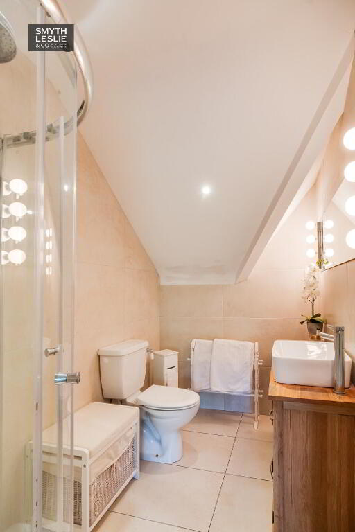 White suite, corner shower cubicle, thermostatically controlled shower, traditional style vanity unit, heated towel rail, fully tiled, recessed lighting.