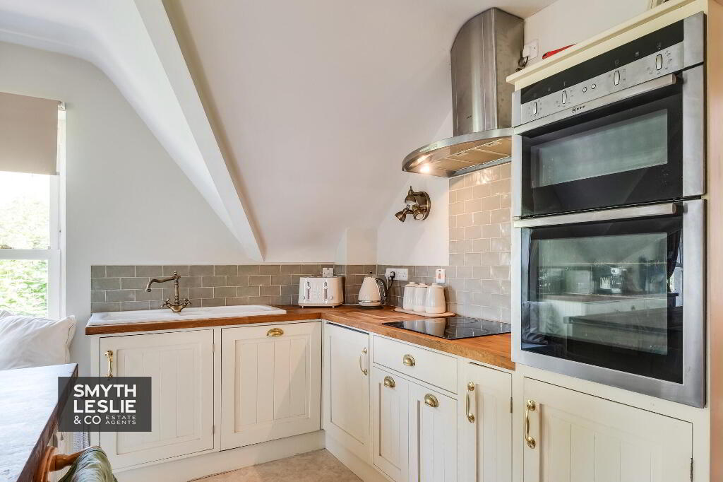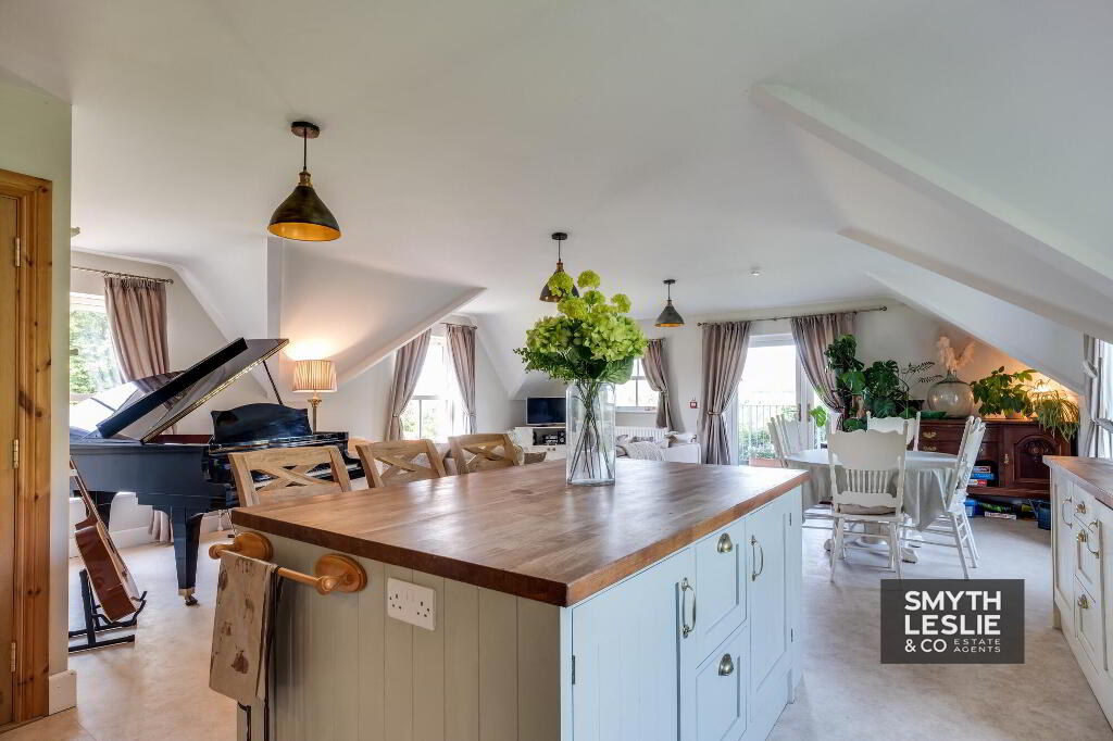 Fitted solid wood kitchen units including island, integrated eye line double oven & grill, hob, dishwasher, ceramic sink unit, extractor fan hood, French doors to balcony area, window seat encapturing Mountain View.