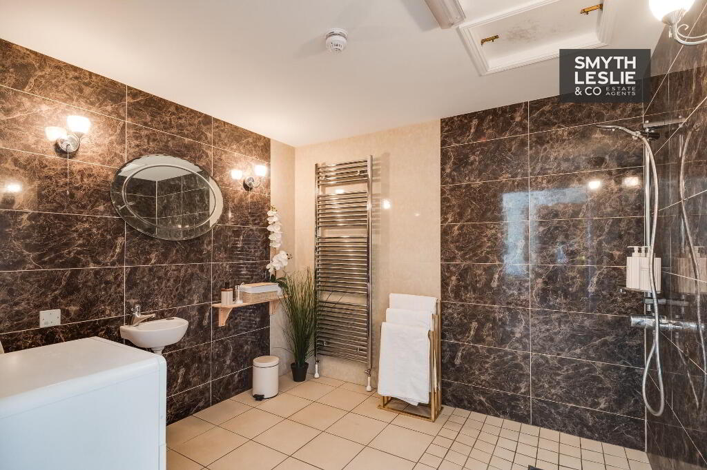 White suite including feature bath, thermostatically controlled shower, fully tiled, disabled designation.