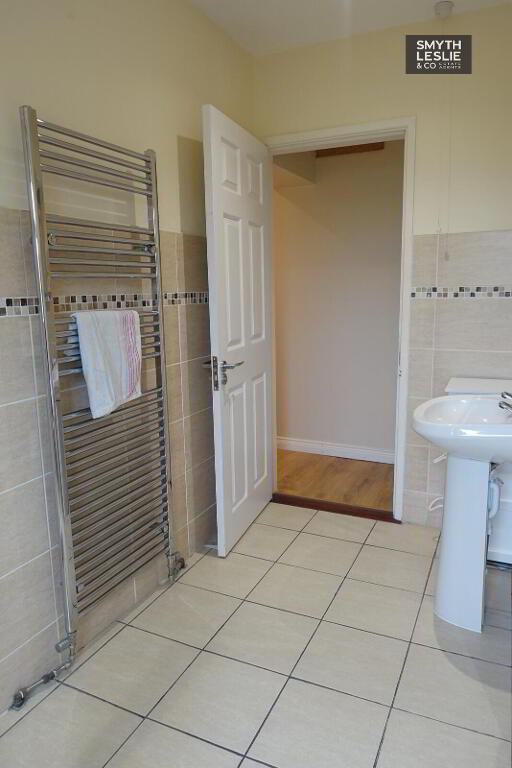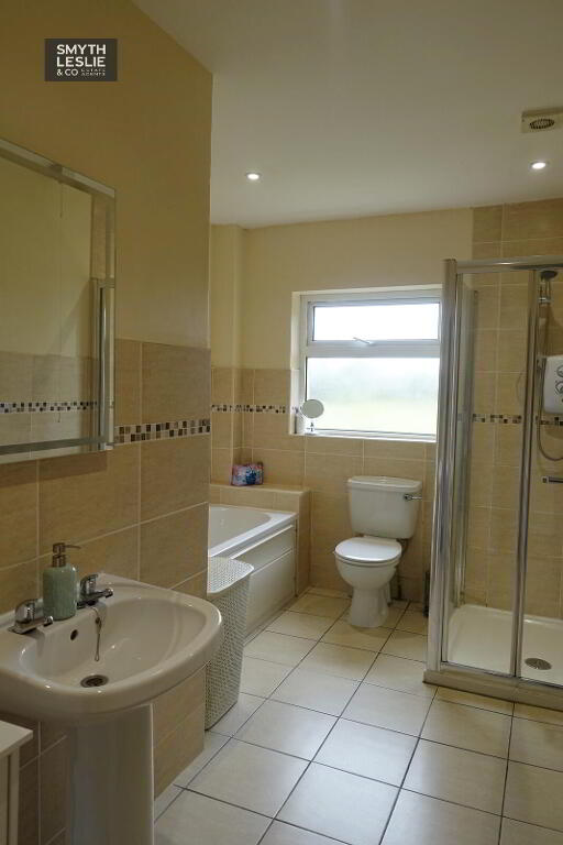 Widest points, white suite, step in shower cubicle with electric shower, fully tiled, heated towel rail, recessed lighting.