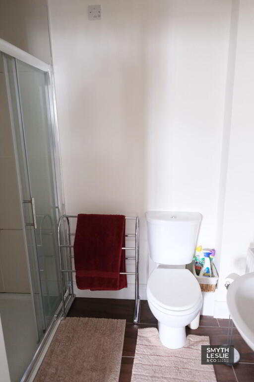 With 3 piece suite, step in shower with electric shower fitting, tiled splashback, tiled floor.