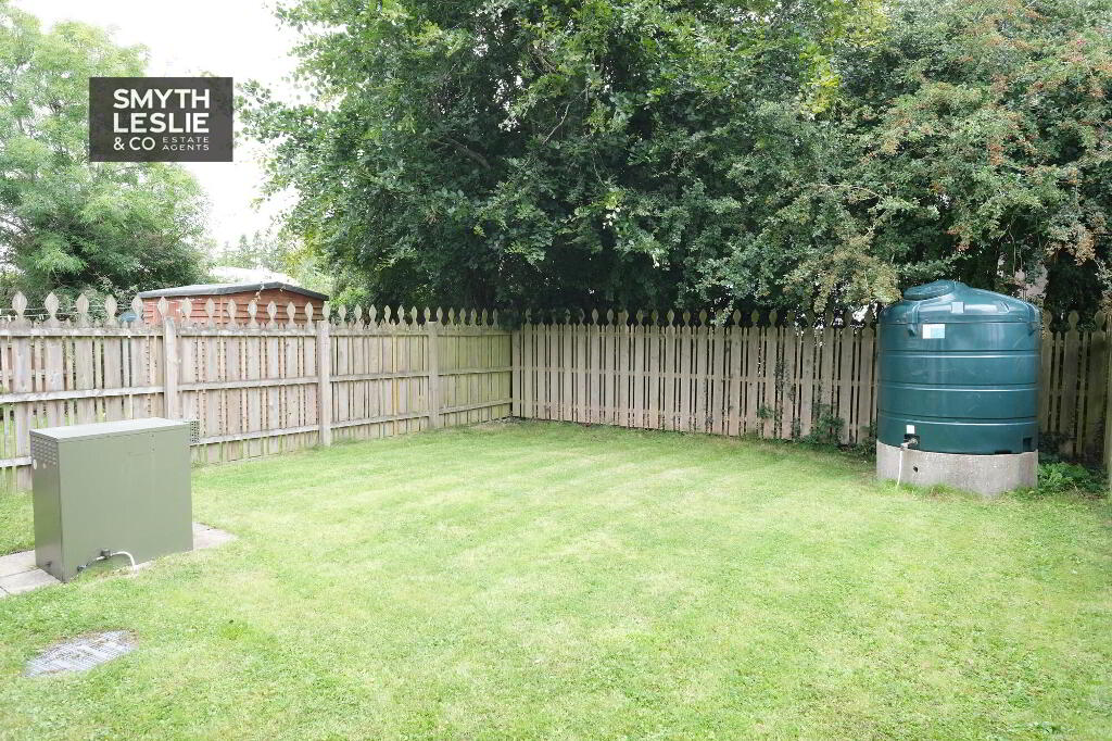 Fully enclosed lawned, private garden to rear. Pedestrian side alleyway access from front of house. Lawned garden to front, tarmac driveway and parking area. PVC oil tank and oil fired boiler to rear.