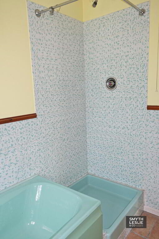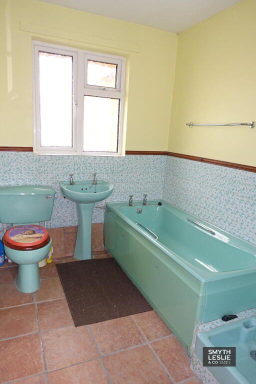 Coloured suite, thermostatically controlled shower, tiled floor & splash back.