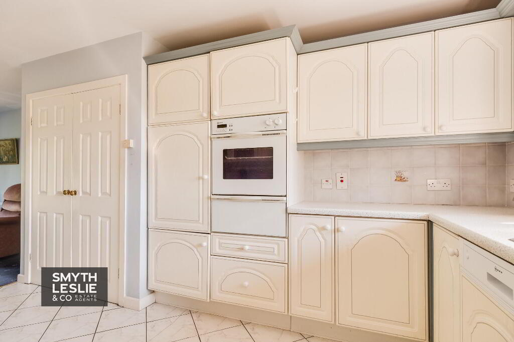 Fitted kitchen with a range of high & low level units, glazed unit, integrated hob, oven & grill, dishwasher, fridge,extractor fan hood, s.s.sink unit, breakfast bar, part tiled floor & splash back, hot press, sliding patio door to patio area & private garden