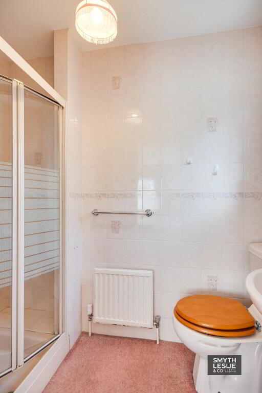 Coloured suite, step in shower cubicle with thermostatically controlled shower, fully tiled walls