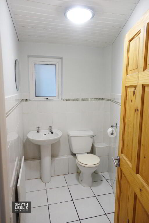 Wc & whb, tiled floor & half tiled walls, PVC cladding on ceiling.