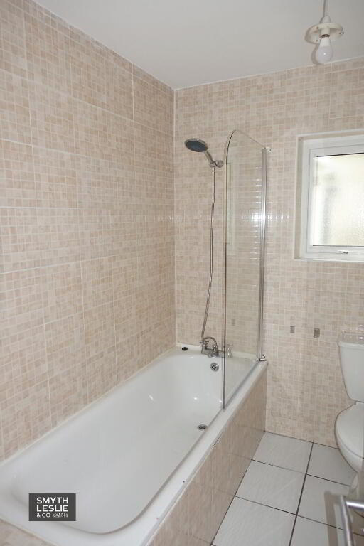 3-piece white suite, shower screen to bath with shower tap off bath, tiled floor, fully tiled walls.