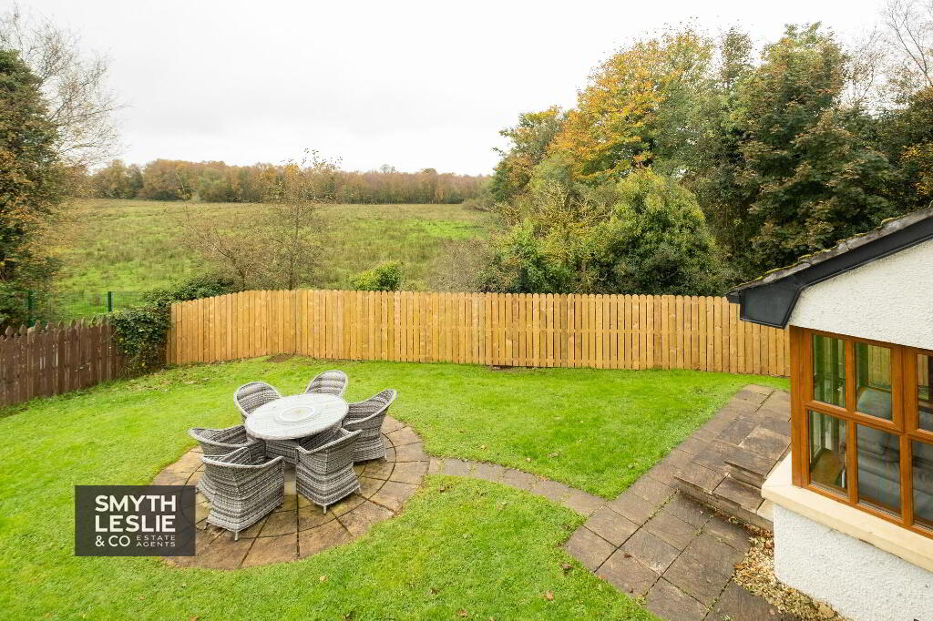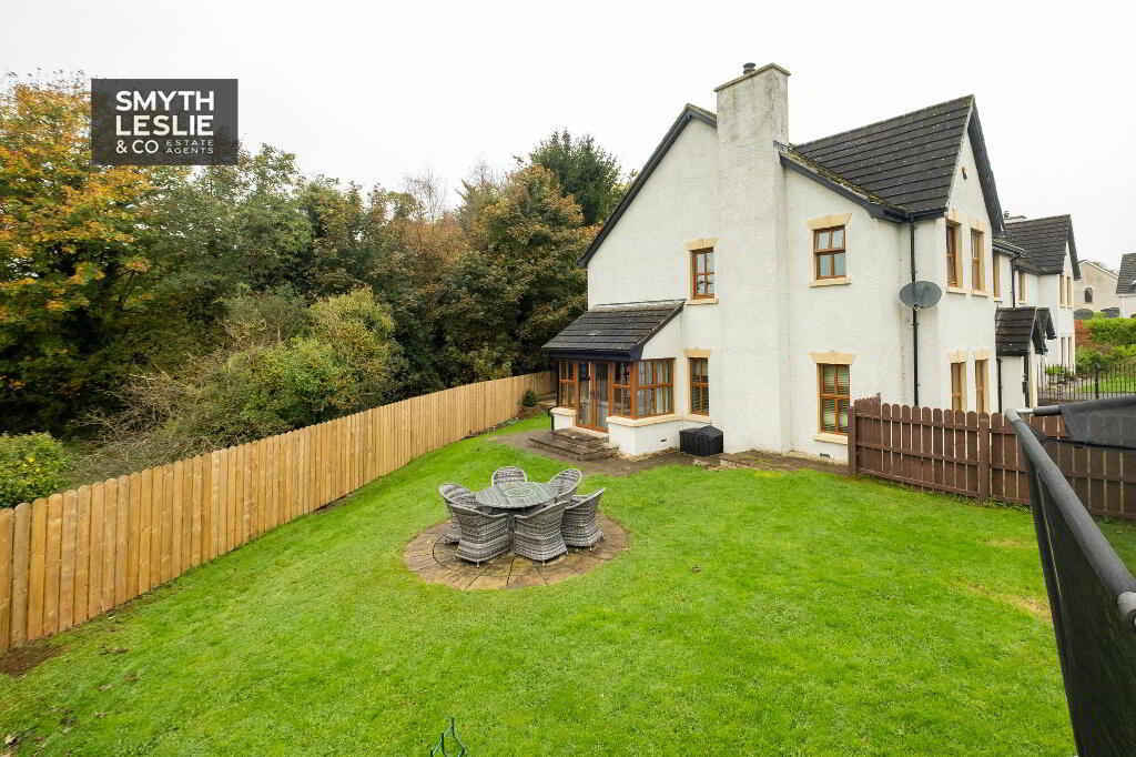 Externally, the property offers excellent outdoor space designed for both practicality and enjoyment. To the side, a tarmac driveway provides generous off-street parking, while the surrounding gardens to the side and rear create a delightful setting for family living. The spacious lawn and paved patio area offer ideal spaces for outdoor relaxation, seamlessly blending with the home’s natural surroundings. To the rear, an extensively paved area provides superb versatility, perfect as a safe play space for children or an enclosed area for small pets. All of this is beautifully framed by the tranquil backdrop of mature woodland, enhancing the sense of privacy and connection with nature.