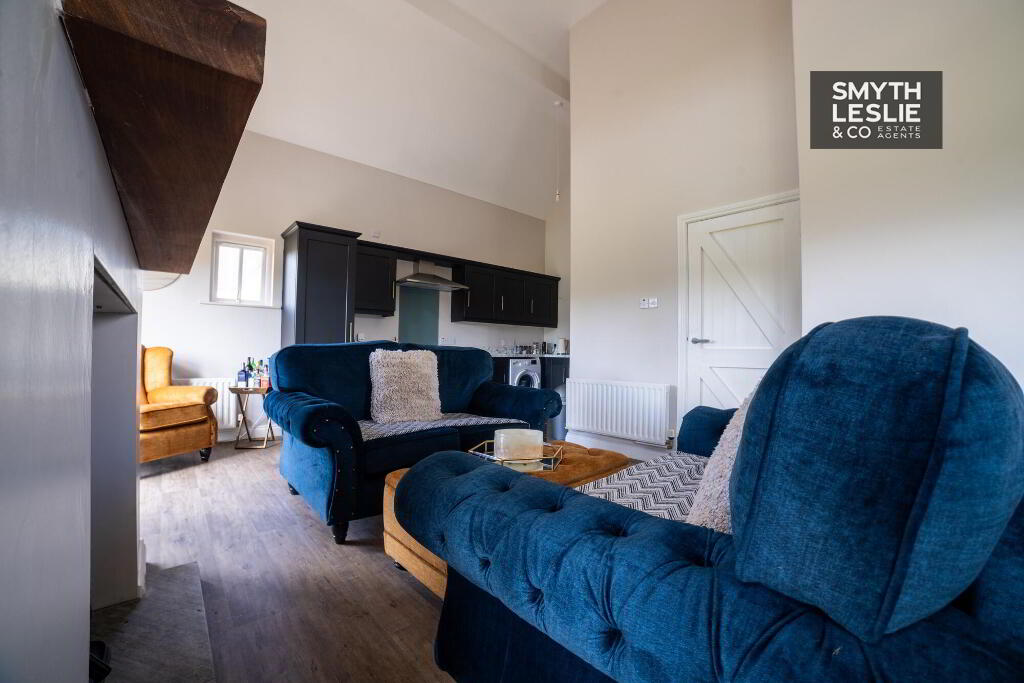 High ceiling and window feature, solid fuel stove, 2 no. double patio doors looking onto paved patio area. Fully fitted bespoke kitchen with integrated hob, oven and grill, fridge freezer and dishwasher, clay tiled floor.