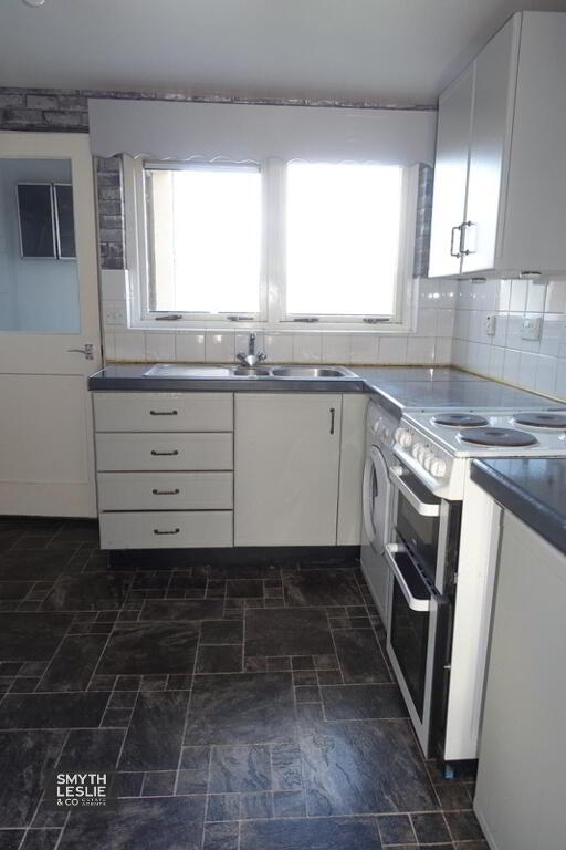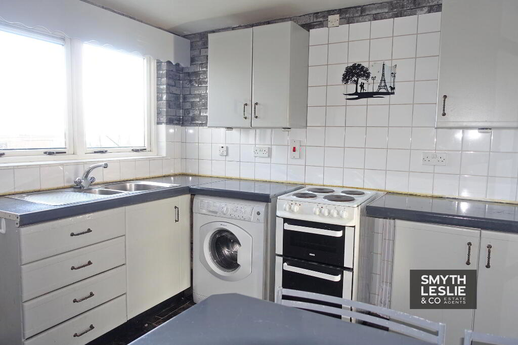 Fitted high and low level kitchen units, stainless steel sink unit, plumbed for washing machine, tiled splash back, breakfast bar, glazed door to Lounge.