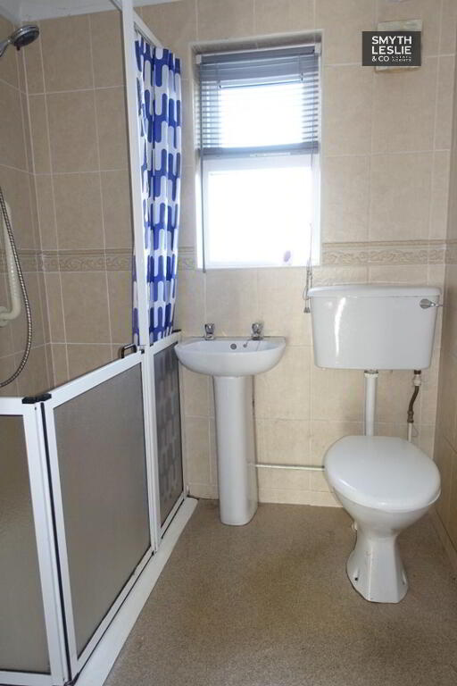White suite, shower with electric shower unit, non slip floor, fully tiled walls.