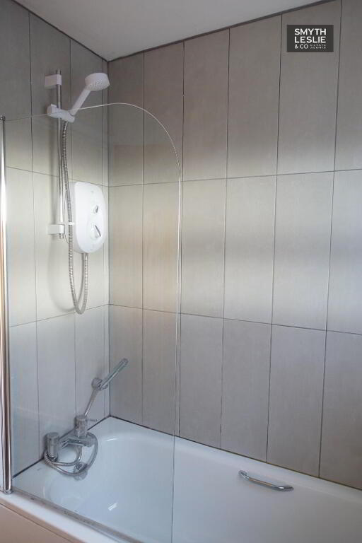 White suite comprising wash hand basin, WC, and bath, tiled walls.
