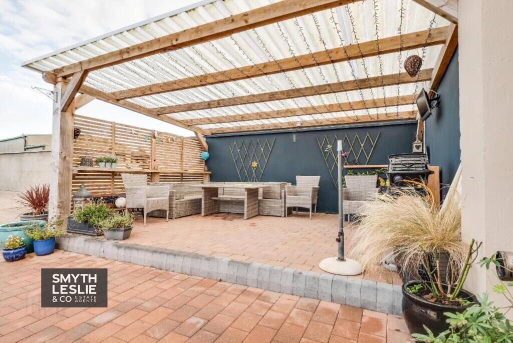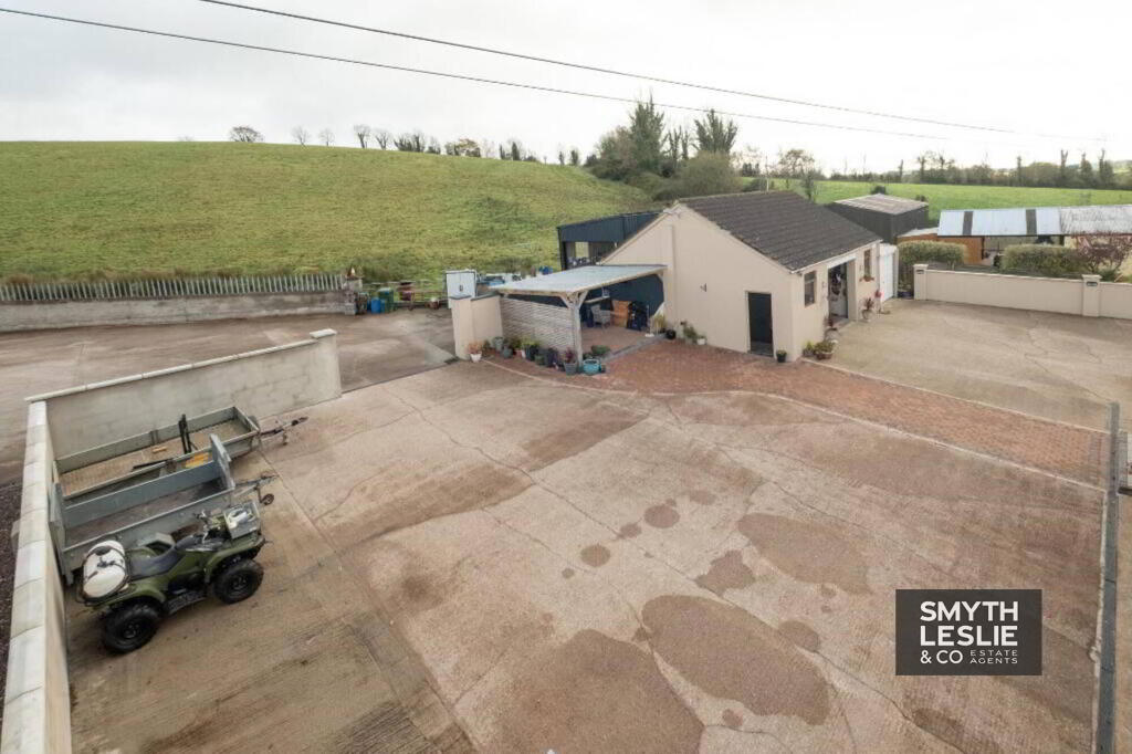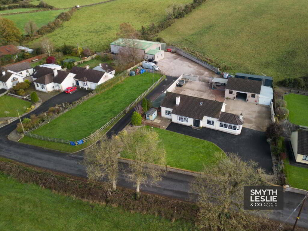 The property is set within beautifully matured grounds that perfectly complement its charming country setting. To the front, an attractively landscaped garden creates a welcoming approach, framed by well-tended lawns and established planting that provide colour and character throughout the seasons. To the rear, an extensive parking area offers excellent space for vehicles, further enhanced by a substantial garage providing additional storage and practical convenience. A feature raised and covered patio area completes the outdoor, offering an ideal space for entertaining, dining, or simply relaxing while enjoying the tranquil surroundings.