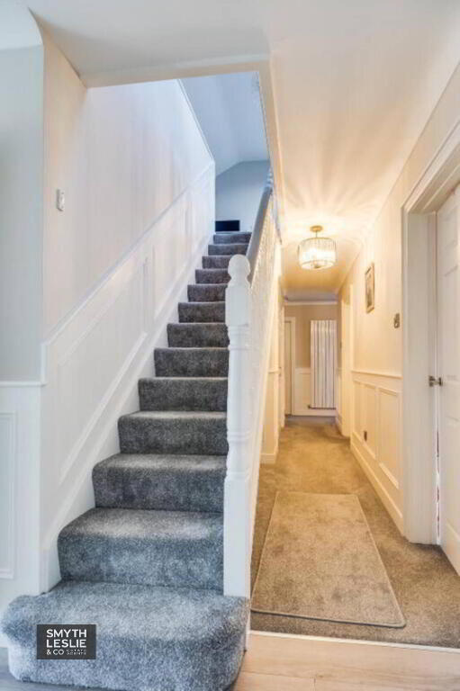 Moulded wall panelling, hotpress, wall mounted tall radiator, staircase.