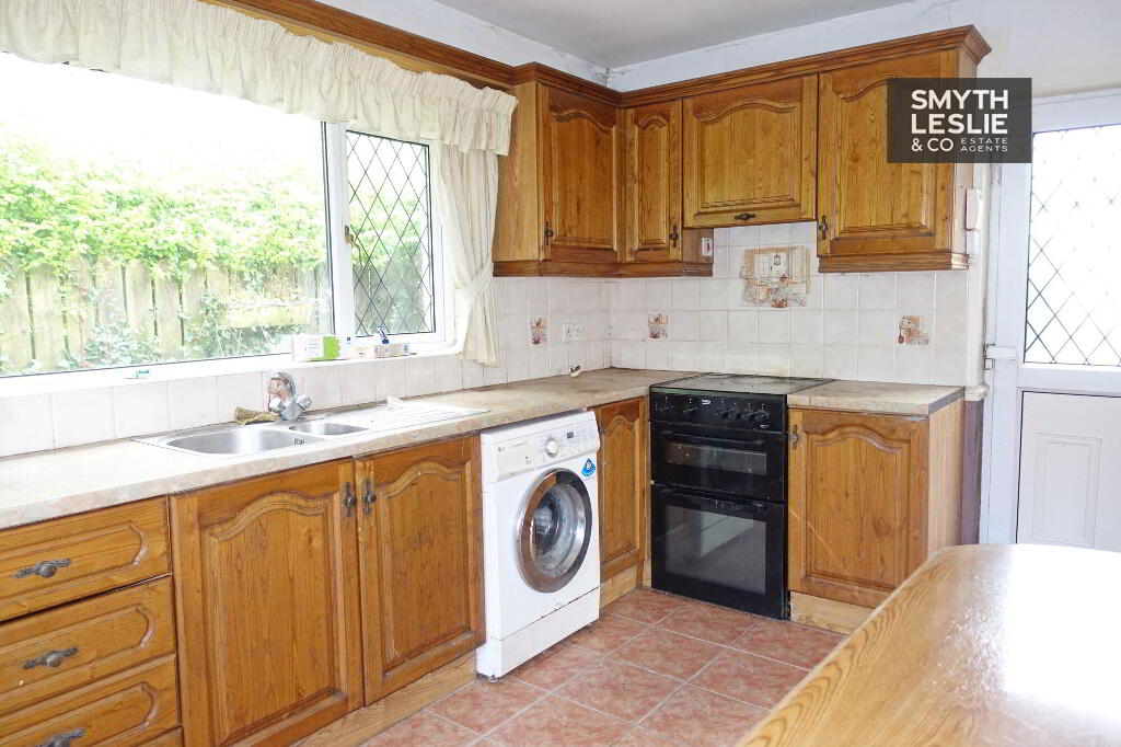 Kitchen: 15’1” x 9’8” Range of fitted high & low level kitchen units, stainlesssteel sink unit, extractor fan hood, plumbed for washing machine, tiled floor and splash back, PVC exterior door with glazed inset.