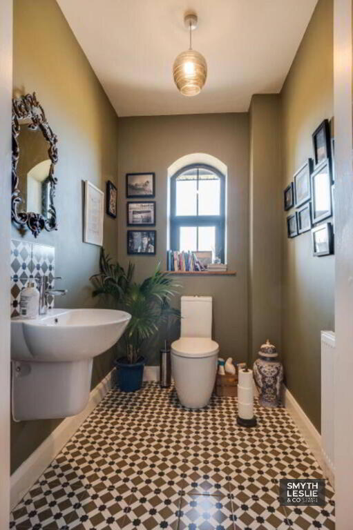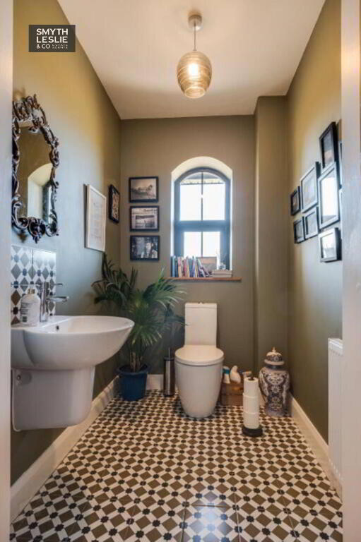Wc & whb, decorative tiled floor & splashback.