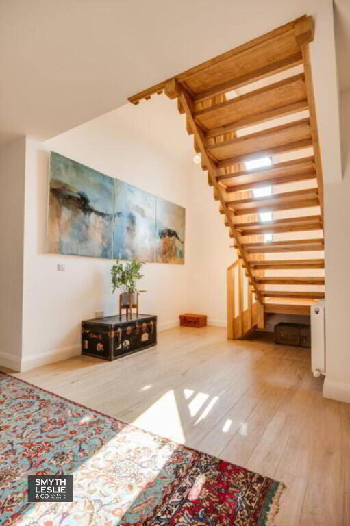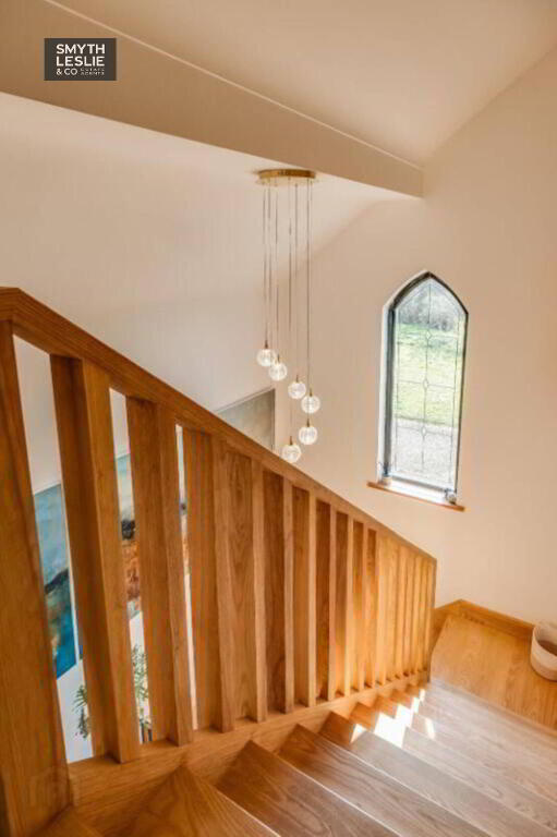 Hand built solid oak staircase overlooked by feature window, wood grain tiled floor.