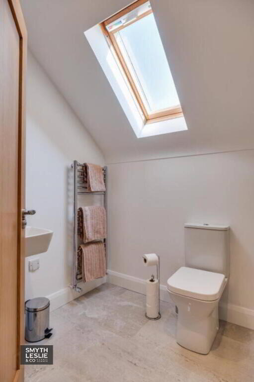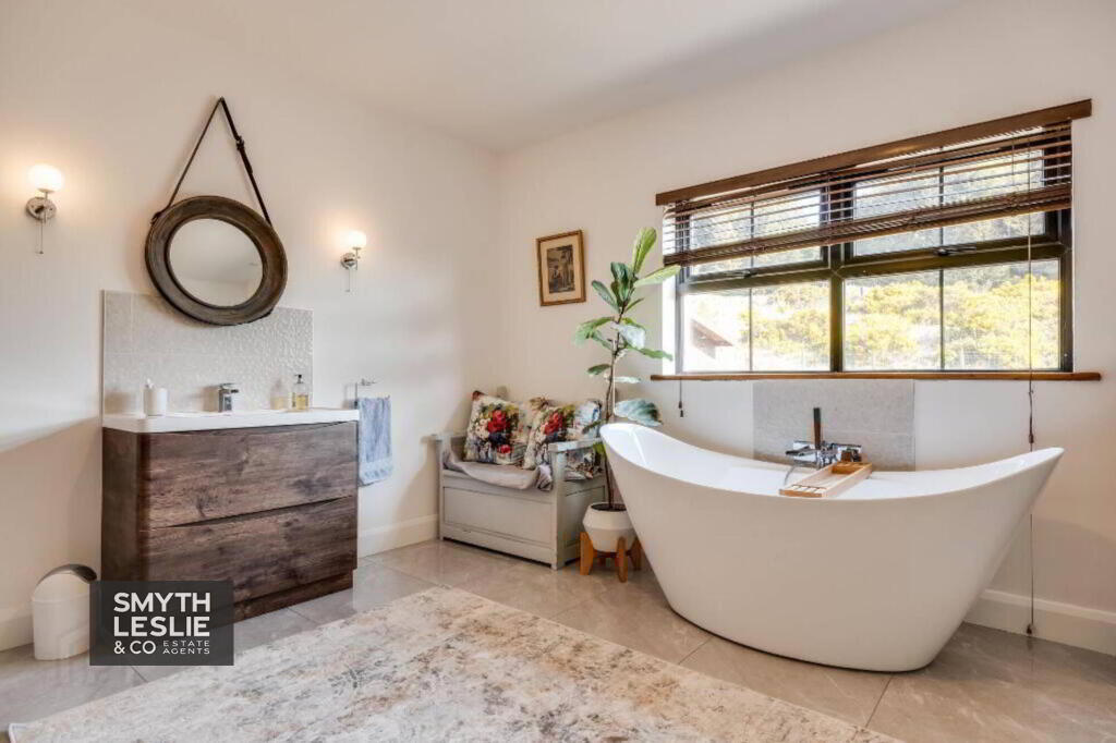 Luxury white suite incl. feature bath, wall fitted mixer taps, vanity unit with ceramic sink, large step in shower cubicle with glazed side & thermostatically controlled shower, heated towel rail, tiled floor & splashback.