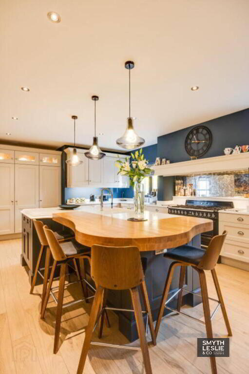 Luxury fitted kitchen with extensive features, excellent range of units including island centrepiece with ceramic sink, granite drainer & solid wood breakfast bar lip, granite work top, integrated dishwasher, larder cupboard, integrated fridge, second ceramic sink with granite drainer, `SMEG` range cooker incl. 7 ring gas hob, electric double oven & grill, feature traditional style surround including over mantle, extractor fan, mirrored splashback, recessed lighting, tiled floor.