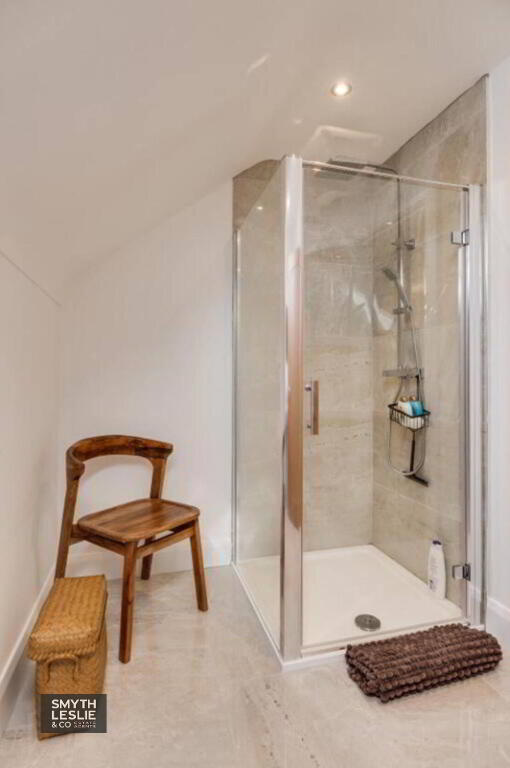 Luxury white suite, step in shower cubicle with glazed sides, thermostatically controlled shower, recessed lighting, heated towel rail, tiled floor & splashback.