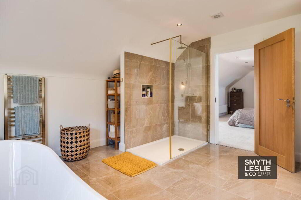 Luxury white suite incl. feature bath with free standing mixer taps vanity unit with double ceramic sink, wc with concealed push button controls, large step in shower cubicle with glazed sides and thermostatically controlled shower, alcove shelf, tiled floor & splashback, recessed lighting, feature wall panelling, heated towel rail.