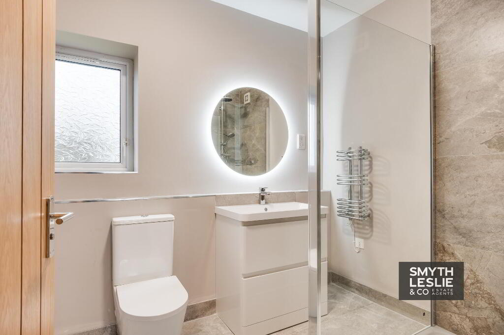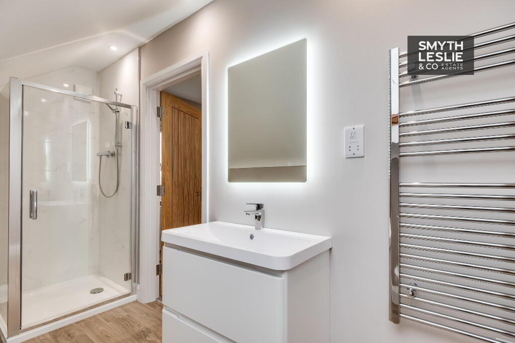 Contemporary suite, step-in shower, vanity unit, tiled surround, LED mirror, heated towel rail.