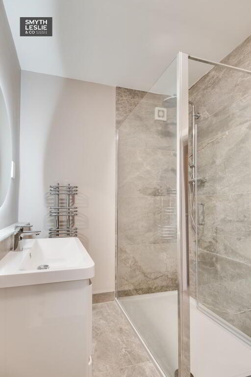Contemporary suite, step-in shower, vanity unit, heated towel rail.
