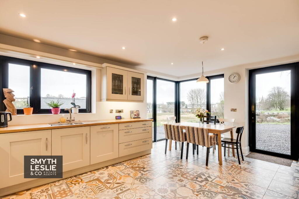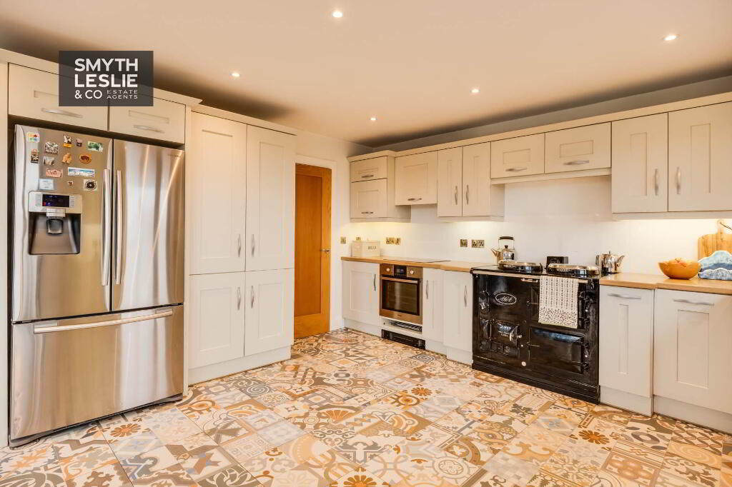 Fully fitted with an extensive range of high & low level units, AGA oil fired cooker, integrated hob, oven & grill, dishwasher, fridge freezer, decorative tiled floor, recessed lighting, feature corner window with views towards the River Erne.