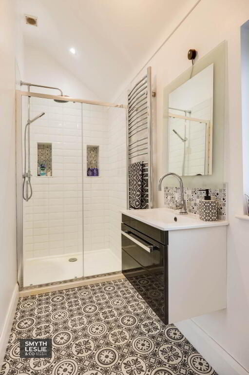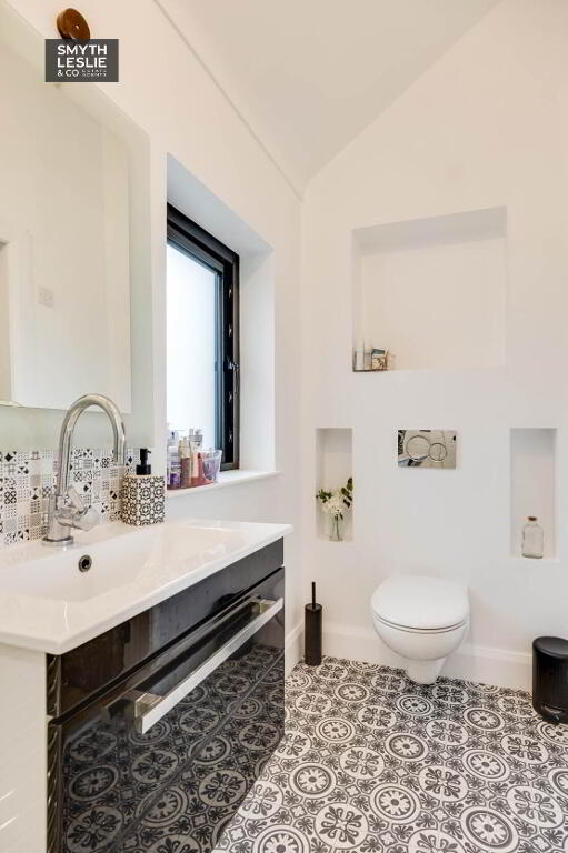 White contemporary style suite incl. shower cubicle with thermostatically controlled shower, concealed wc with push button control, recessed shelving, vanity unit, heated towel rail, tiled splashback.