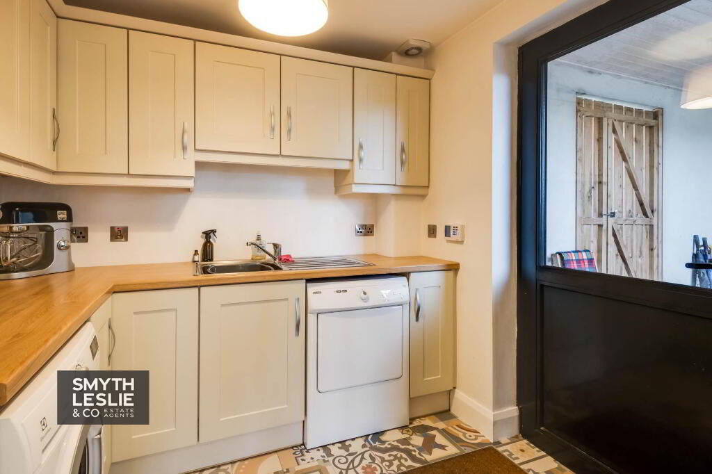 Fitted high & low level units, plumbed for washing machine, aluminium exterior door with glazed inset.