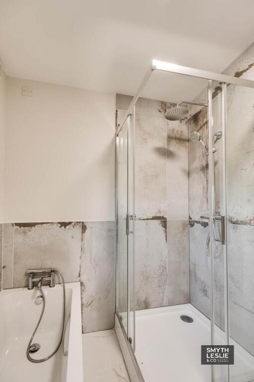 White suite including bath, step in shower cubicle, thermostatically controlled shower, heated towel rail, half tiled walls, laminate flooring.