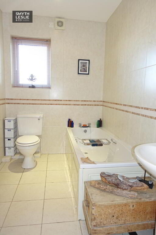 Bathroom: 9’2” x 5’10” & 2’6” x 2’3” White suite, step in shower cubicle with thermostatically controlled shower, fully tiled, recessed lighting.