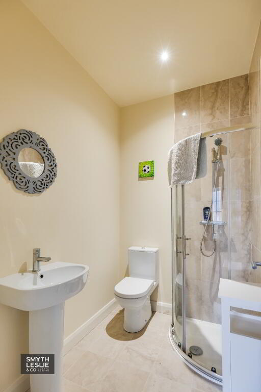 En-suite: 6’9” x 5’2” White suite, step in shower cubicle with thermostatically controlled shower, tiled floor & splash back, recessed lighting