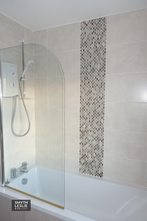 White suite, electric shower over bath shower screen, fully tiled, panelled bath, fitted cabinets.
