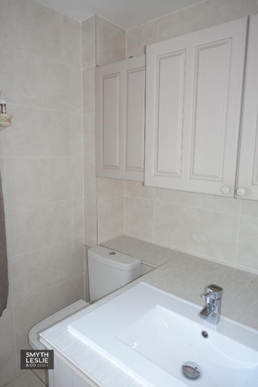 Suite with step in shower cubicle & thermostatically controlled shower, fully tiled.