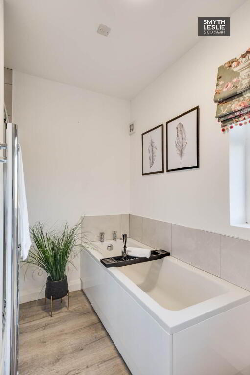 White suite, step ins shower cubicle with thermostatic shower, tiled splash back laminated floor, heated towel rail.