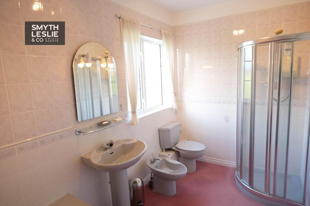 With 4-piece suite including corner bath, bidet, WC and wash hand basin, step in shower cubicle with electric shower fitting, spot lighting, fully tiled walls.