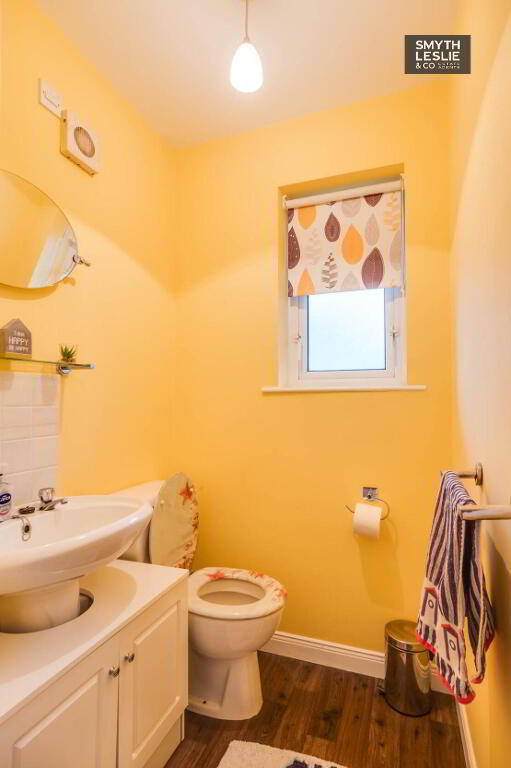 Wc & whb, laminate flooring, tiled splash back, cabinet.
