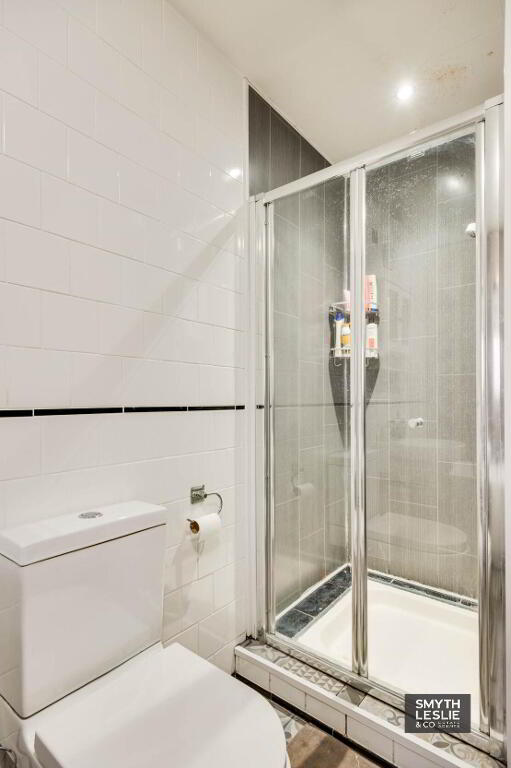 (10`11` x 5`6` & 4`6` x 2`11`) Contemporary white suite, feature bath, hand held shower tap to bath, step in shower cubicle with electric shower, fully tiled inc decorative tiled floor & feature wall