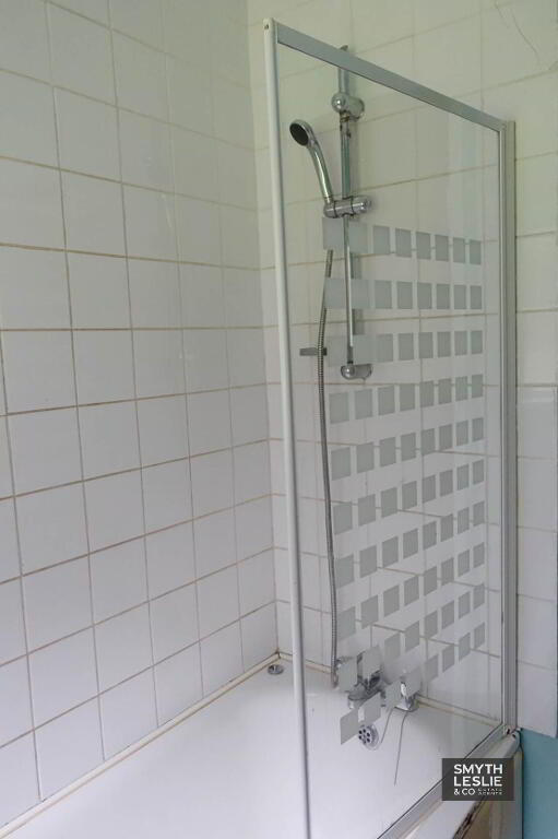 White suite, cast iron bath, shower head over bath & shower screen, tiled,floor & splash back, heated towel rail