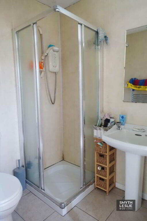 White suite, step in shower cubicle with electric shower, tiled floor, PVC wall cladding