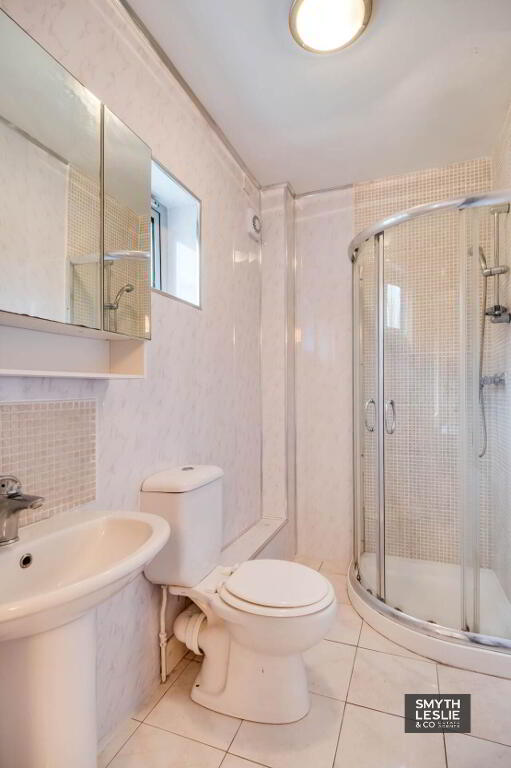 White suite, step in shower cubicle with thermostatically controlled shower, tiled floor & splash back, PVC protective wall panelling