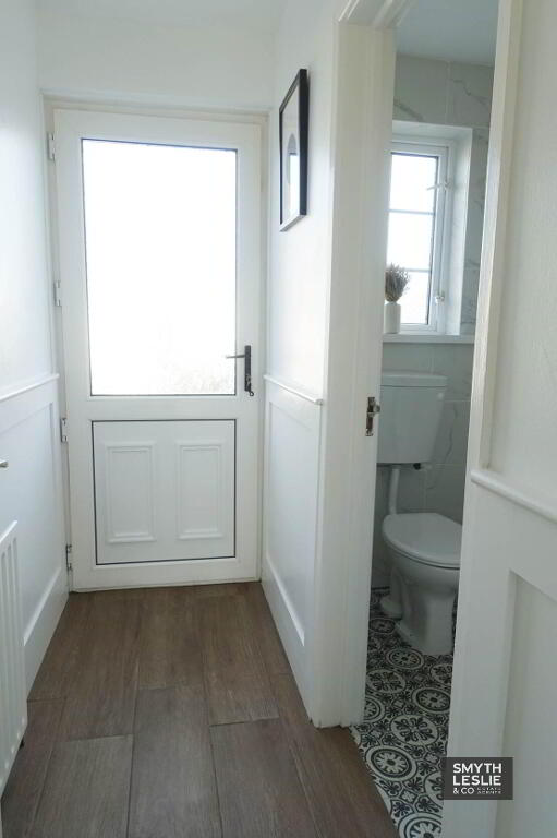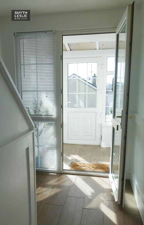 PVC exterior door with glazed inset & side screen, wood grain tiled floor, decorative wall panelling, under stairs storage
