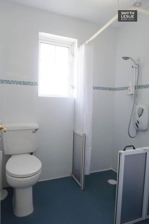white suite, wet room floor with non slip finish, electric shower, fully tiled walls,