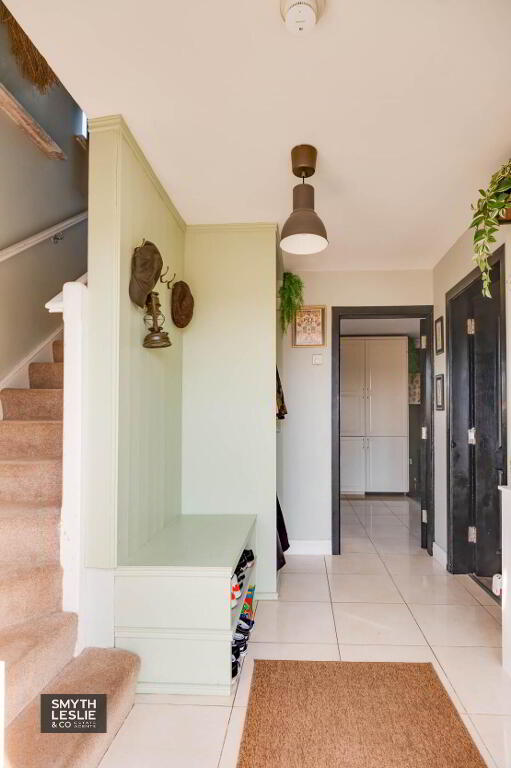 PVC exterior door with glazed inset and side screen, tiled floor, fitted boot and cloaks area.