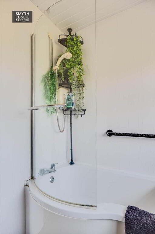 White suite, electric shower over bath with shower screen, tiled floor, PVC protective ceiling & wall panelling, heated towel rail.