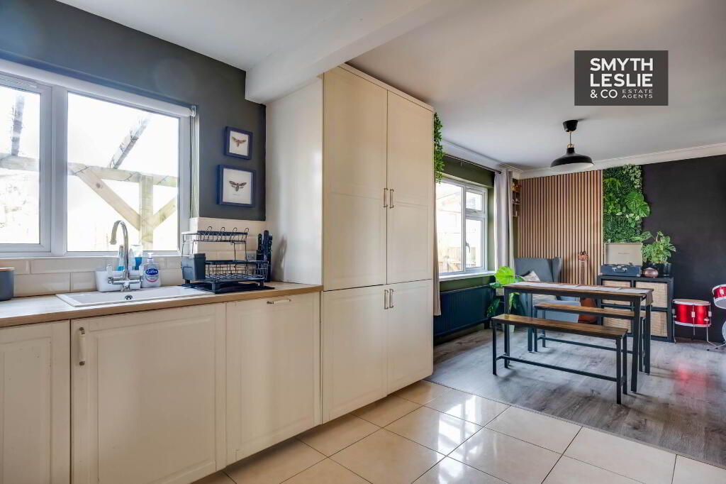 Fitted kitchen with a range of high & low level units, integrated fridge freezer, dishwasher, extractor fan hood, composite sink unit, tiled floor to Kitchen, tiled splash back, laminate flooring to Dining Area, partially glazed door to Entrance Hall, PVC exterior door, feature wall panelling.