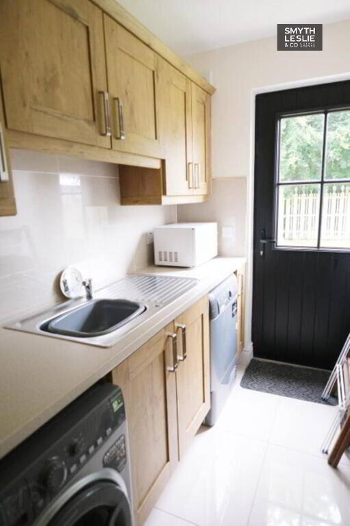 With stainless steel sink unit, high and low level cupboards, tiled in between, fridge freezer, plumbed for washing machine and tumble dryer, tiled floor, PVC exterior door.